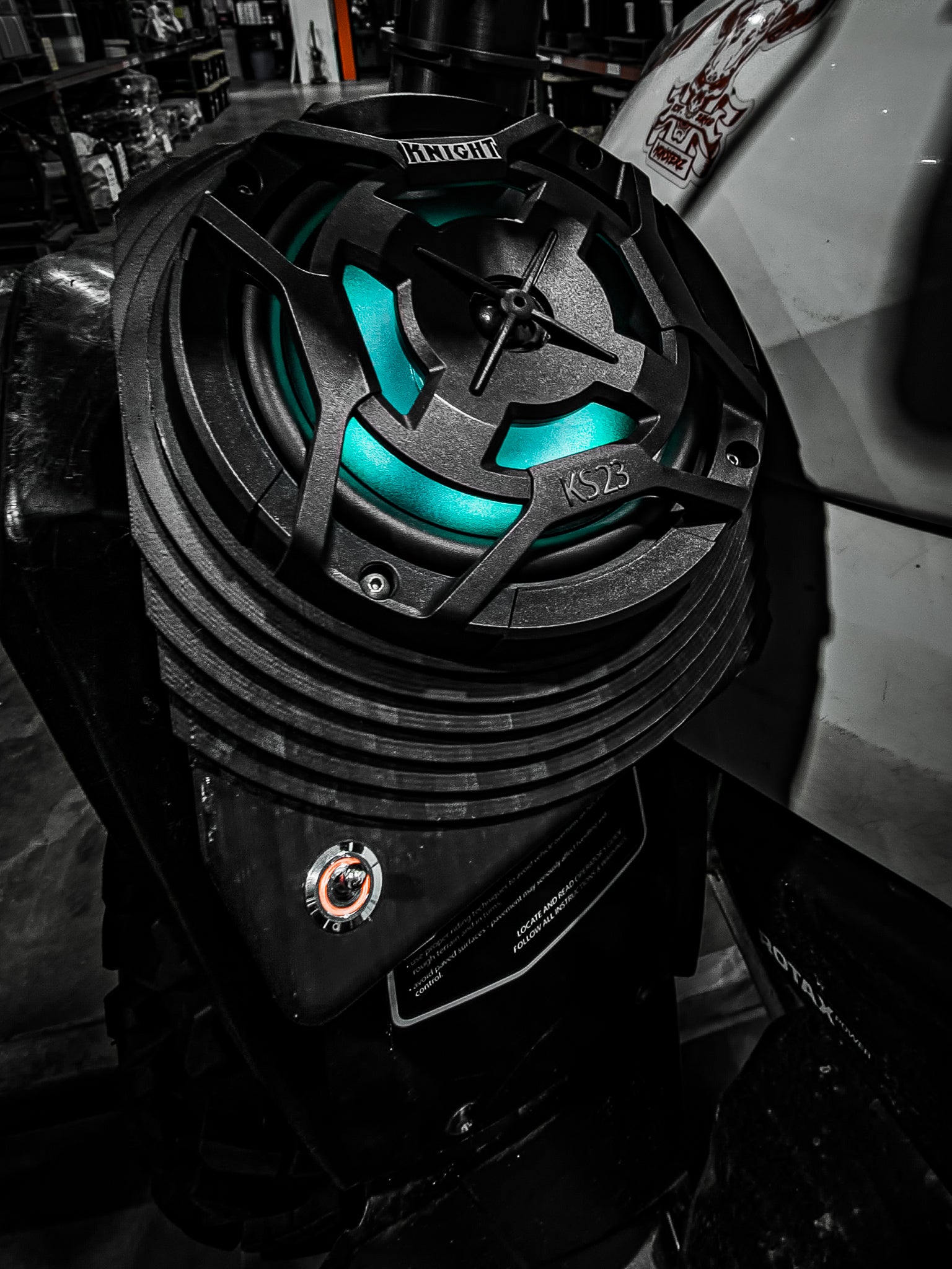 Integrated RGB lighting with remote + free app control (iPhone & Android). Customize colors, sync to your playlist, and light up the night on the trail.